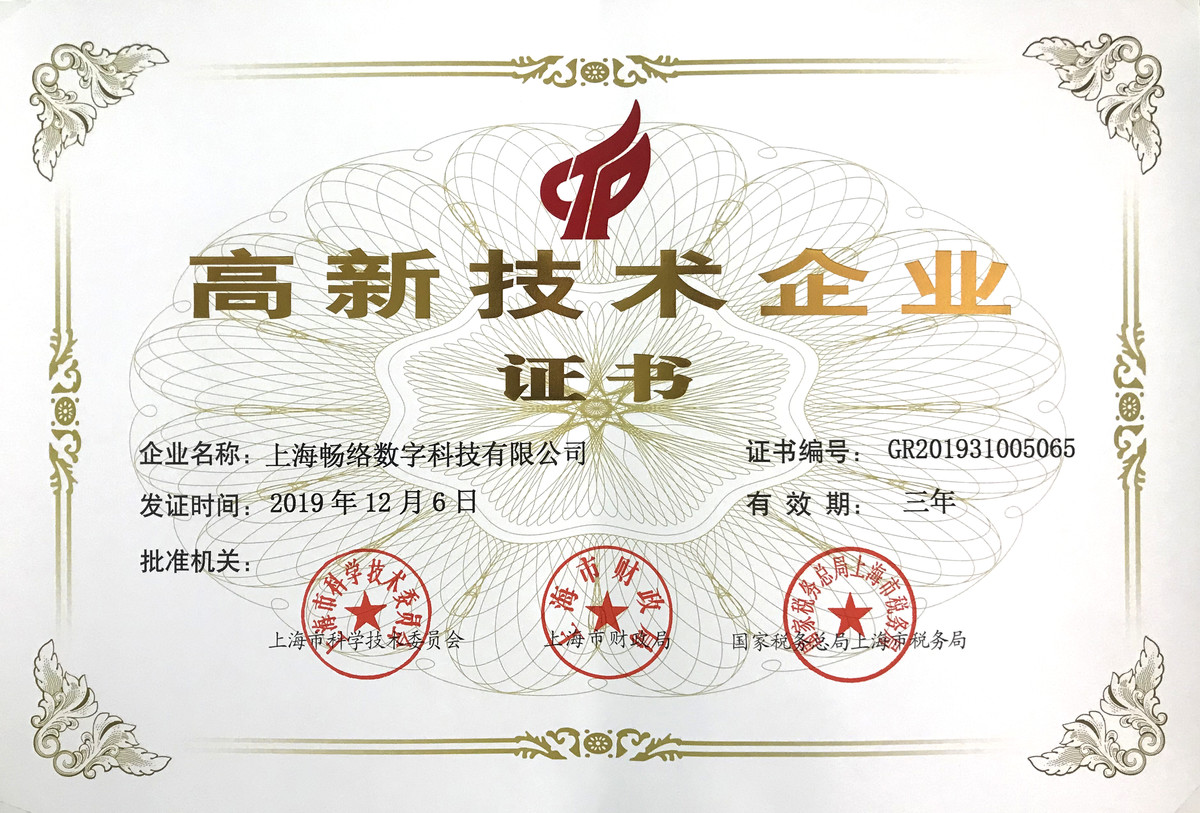近日,畅络数字Changluo Digital正式获得由上海市科学技术委员会、上海市财政局、国家税务总局上海市税务局联合颁发的”高新技术企业“证书。